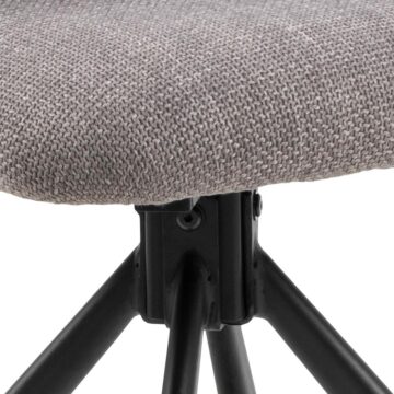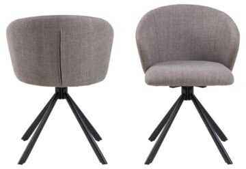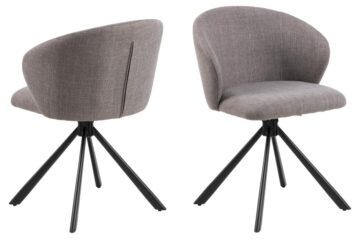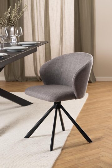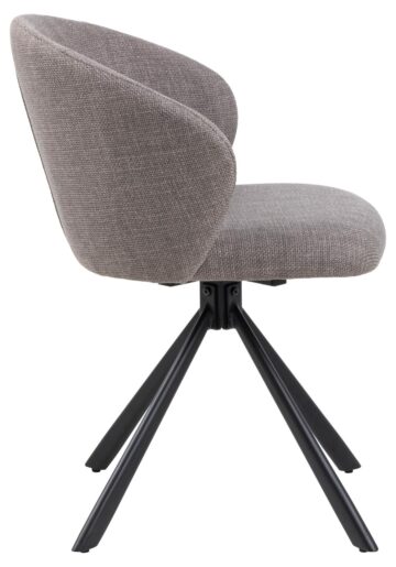 Ta jedilniški stol je primeren tako za posebne priložnosti kot za vsakodnevno prehranjevanje. Ni potrebno vstati ali obračati stola, zahvaljujoč vrteči funkciji. Organske krivulje sedeža in vitka črna kovinska osnova dajejo stolu ženstven videz. Pokrit s strukturno tkanino z dvotonskim učinkom, svetlo sivo-rjava prevleka stolu dodaja zanimivost.
