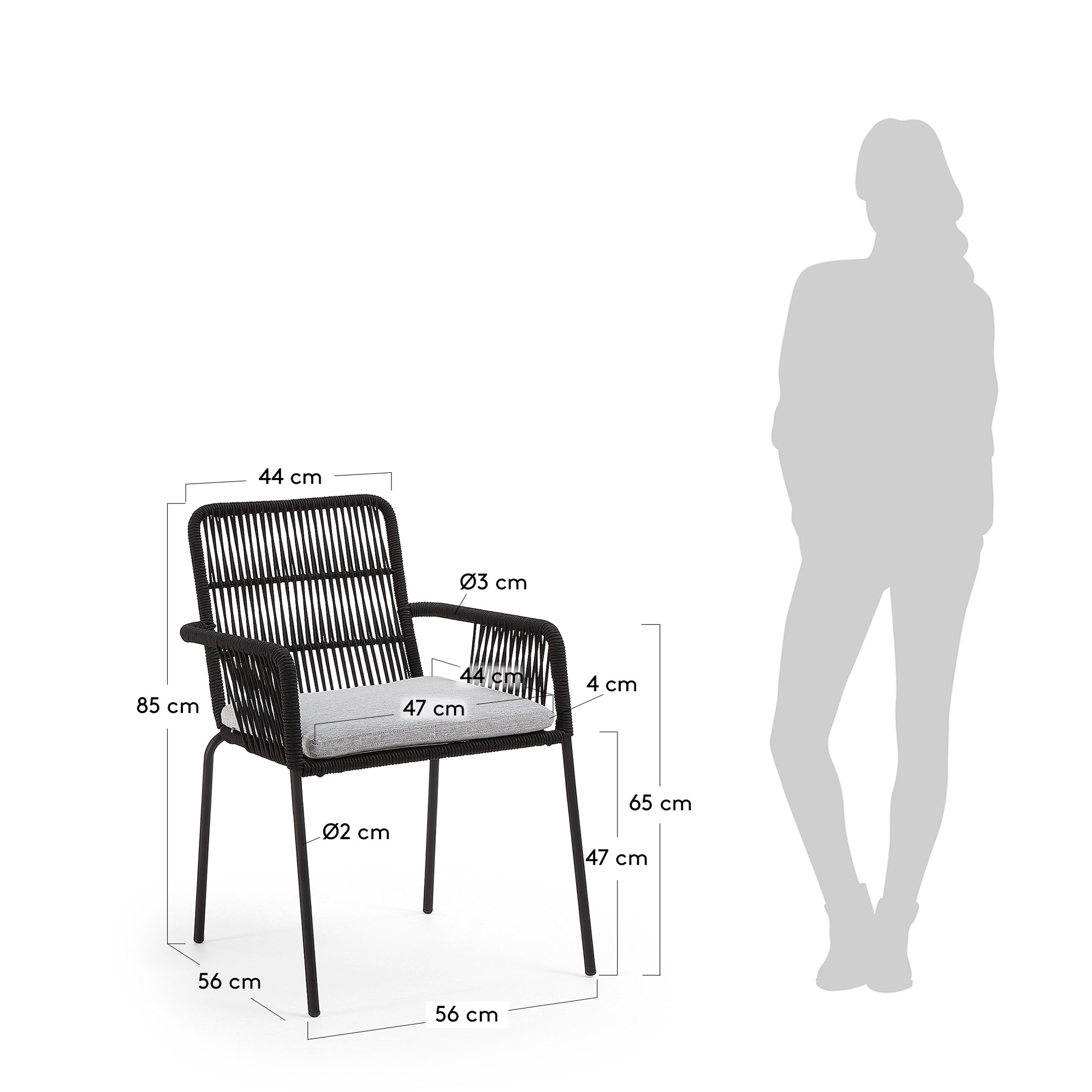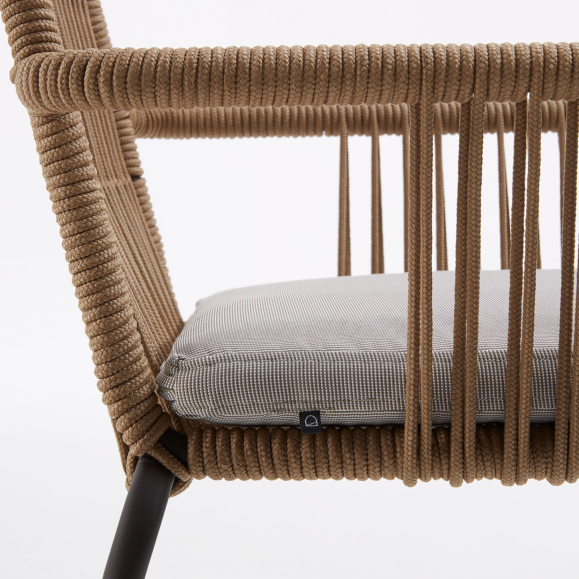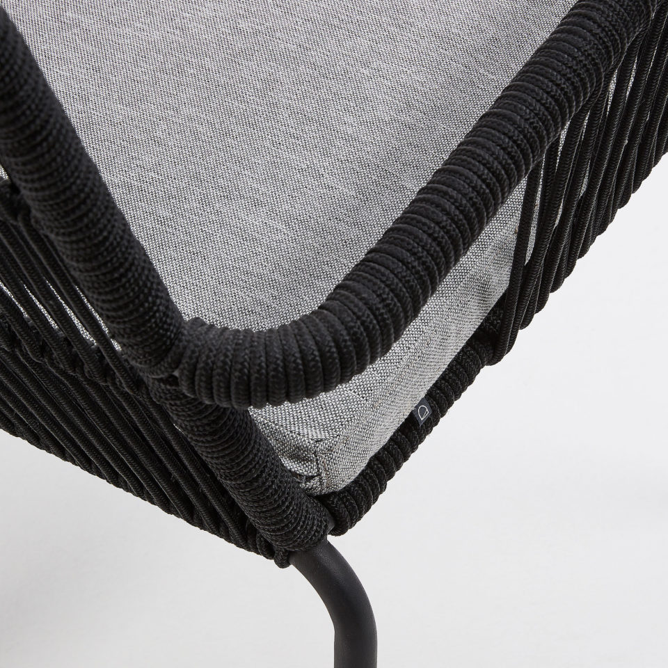 Stol Samt ima udoben naslon za hrbet in roke ter blazino, ki je že všteta v ceno. Je večnamenski stol izdelan iz prašno lakiranega jekla in UV stabilne poliestrske vrvi. Uporablja se lahko tudi zunaj in je nalagalen. Vrv je na voljo v črni in bež barvi.