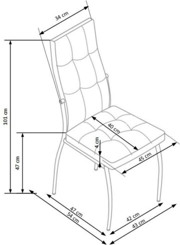 K416 jedilniški stol je sodoben jedilniški stol z ergonomsko obliko in štirimi kovinskimi nogami. Je lahek in vzdržljiv. Sedišče in naslon sta obazinjena v bogato žametno tkanino, design pa obogati tudi kvadratno prešitje.