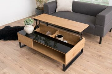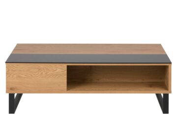 - – s ploščo iz 5-milimetrskega stekla črne barve v kombinaciji z divjim hrastom, prašno lakirano črno podnožje,