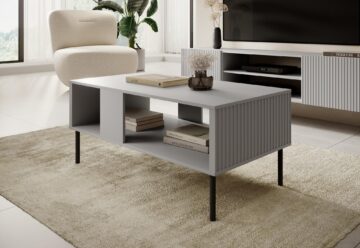 Klubska mizica ASENSIO izstopa kot eleganten in praktičen element vsake moderne dnevne sobe. Z dekorativnimi utori, brezčasno kombinacijo svetlo sive in črne ter vitkimi nogami v črni barvi vnese v prostor lahkotnost in sodobno eleganco.
