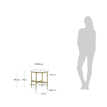 Elegantno oblikovana Steklena klubska mizica Elisenda je izdelana iz kaljenega stekla in kovinske strukture. Sodobna jeklena strukutra je kontrastične zlate barve. Steklena plošča je imitiacija marmorja, oblika plošče je odvisna od dimenzije. Mizino vzdrževanje in čiščenje je zelo enostavno. Dobavljiva je v dveh dimenzijah.