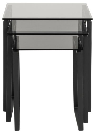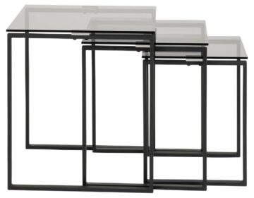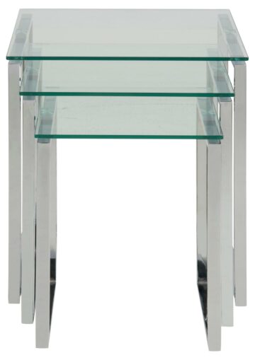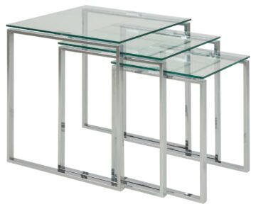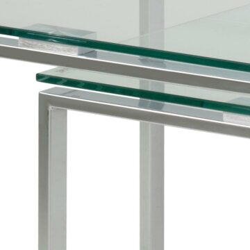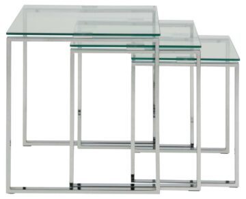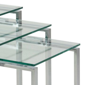Steklena klubska mizica Katrine je set treh modernih steklenih klubskih mizic. Izbirate lahko med klasiko – prozorna steklena površina (8 mm) s kromiranim podnožjem in med sodobno verzijo – črna steklena površina (8 mm) s kovinskim podnožjem obarvanim v črno barvo.