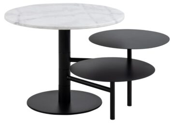 Klubska mizica Lahti prinaša edinstvenost in prilagodljivost v vašo dnevno sobo. Zasnovana s fleksibilnostjo v mislih, ta okrogla mizica s tremi nivoji izstopa s svojimi dvema vrtečima ročajema, ki omogočata prilagodljive postavitve površin. V središču se nahaja vrhnja plošča iz bele marmorja, okoli katere so nameščene tanke črne plošče na različnih višinah.