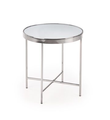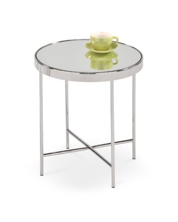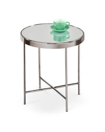 Steklena klubska mizica z okroglo ploščo premera 42 cm. Je estetskega videza in elegantnih oblik, odlično se poda številnim stilom. Izdelana je iz stekla in kromiranega jekla. Visoka je 46 cm.