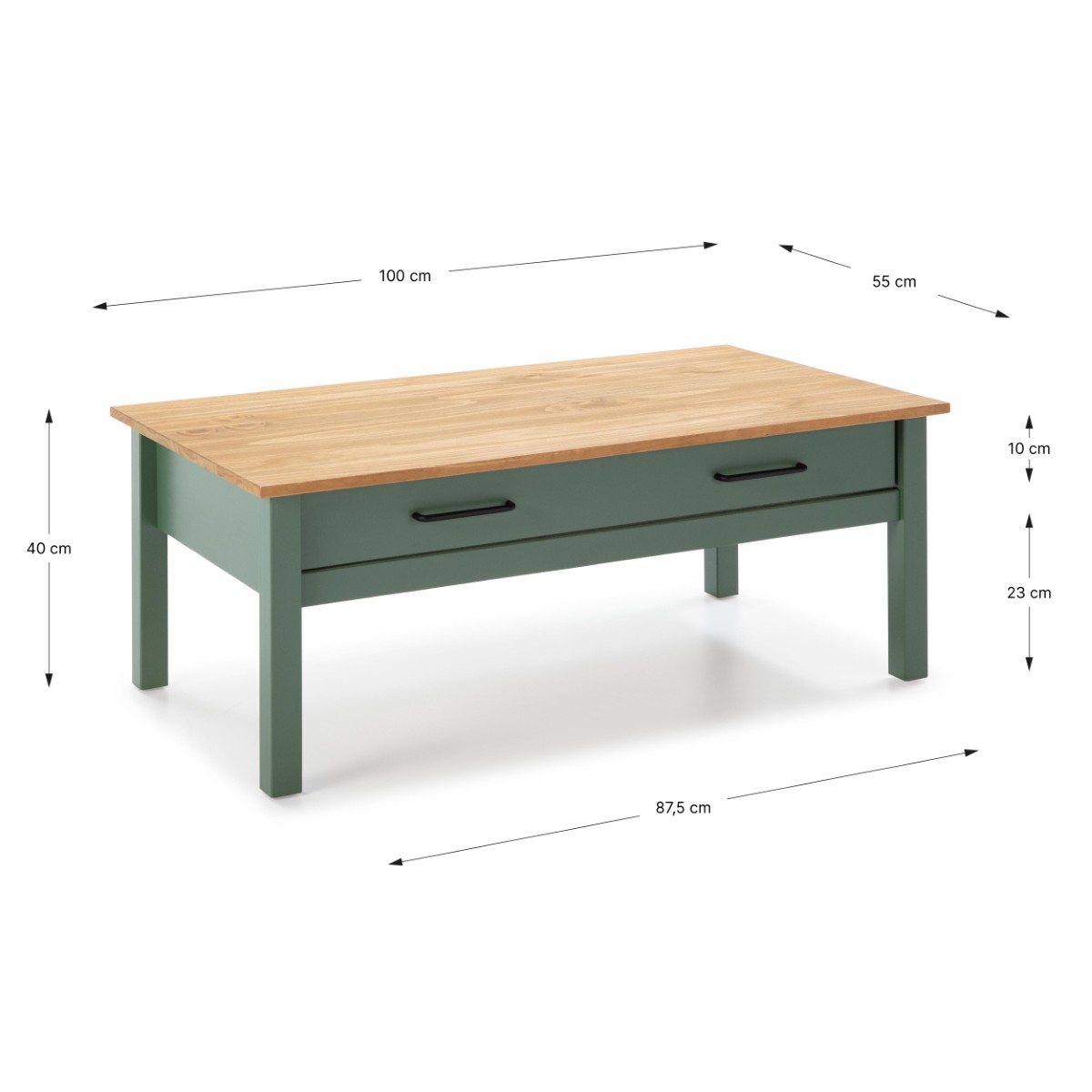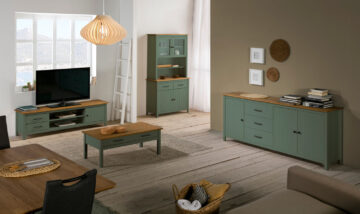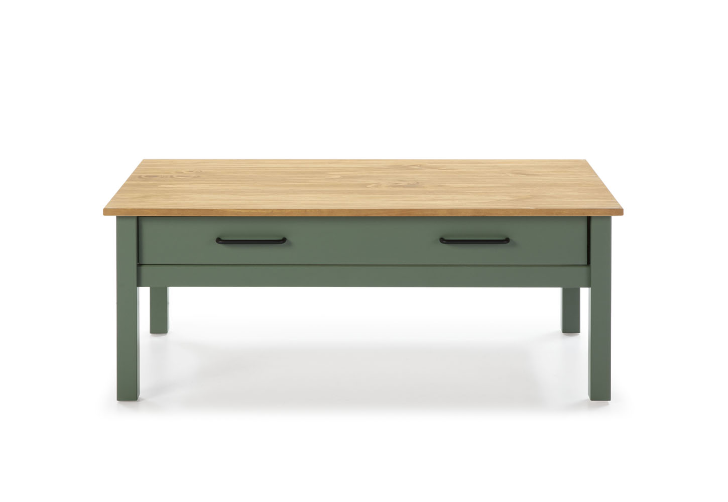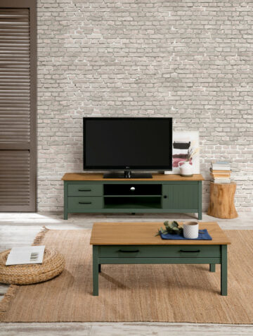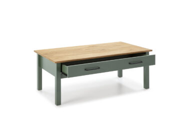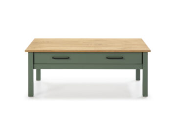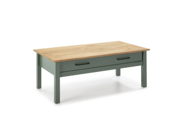 Klubska mizica Miranda v olivno zeleni barvi s kontrastno ploščo v naravnem borovem odtenku prinaša rustikalno toplino v vsakdanje bivalne prostore. Izdelana je iz masivne borovine in nudi praktičen predal, ki omogoča shranjevanje daljincev, revij ali drugih drobnarij.