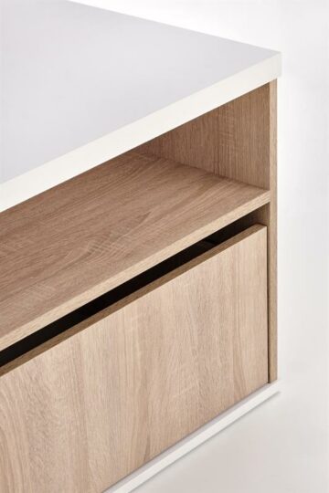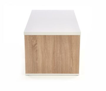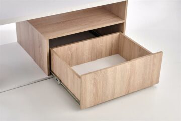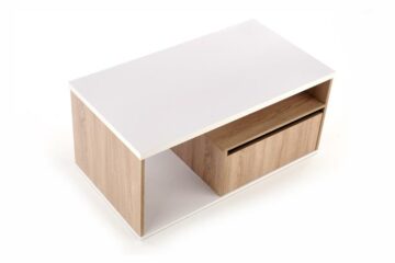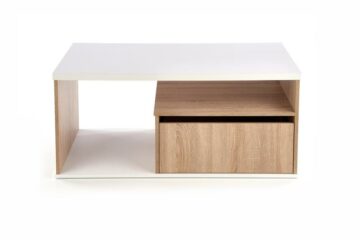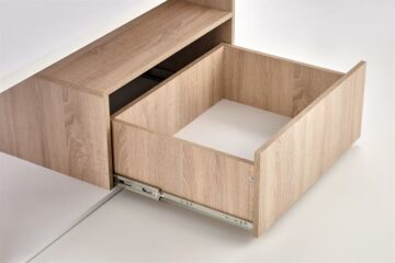 Talna klubska mizica s predalom. Oblikovana je v sodobnem stilu, opaznem v pravokotni obliki in belo/črno-leseni (sonoma hrast) kombinaciji. Izdelana je iz laminirane iverne plošče in furnirja.