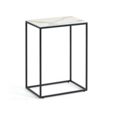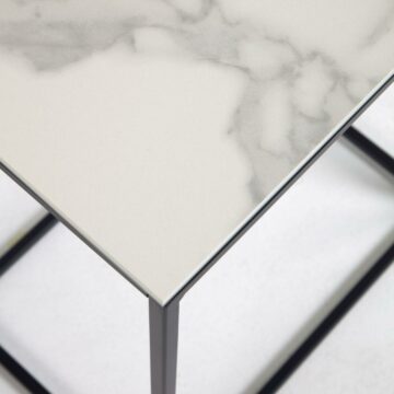 Minimalistično oblikovana Steklena klubska mizica Rewena je izdelana iz večinsko recikliranih materialov: keramike, stekla in kovinske strukture. Geometrijsko pravilno ogrodje je izdelano iz jekla in obarvano črno. Keramična plošča je pravokotne oblike.