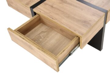 Inovativna klubska mizica s štirimi predali. Oblikovana je v sodobnem in elegantnem slogu, opaznem v novodobni obliki in hrast-črni kombinaciji. Izdelana je iz laminirane iverne plošče.