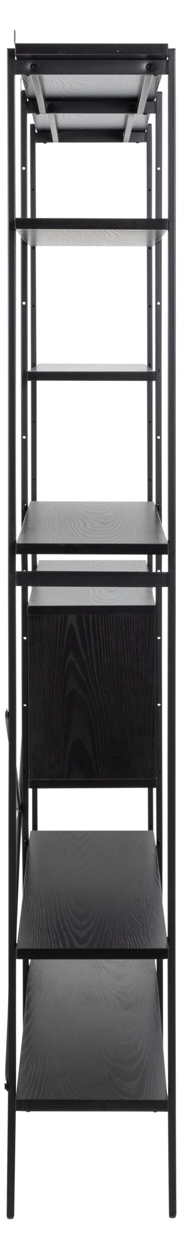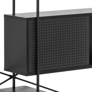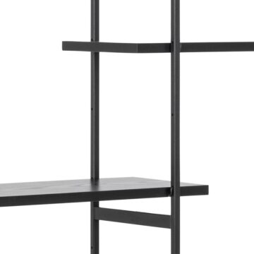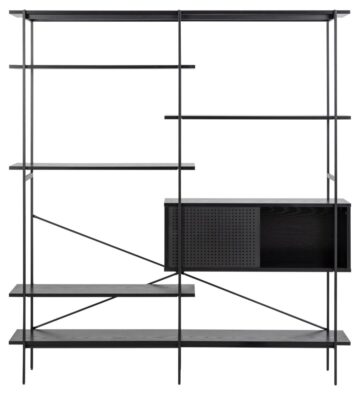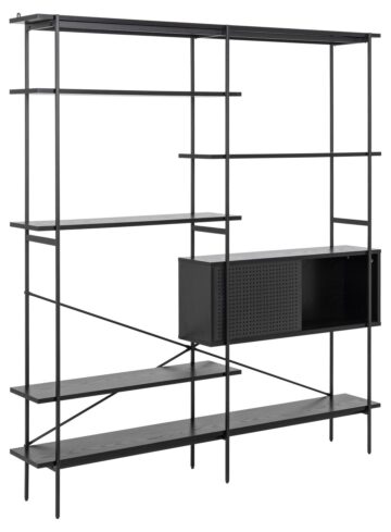 Knjižna polica Angus prinaša edinstveno kombinacijo sodobnega oblikovanja in praktičnosti. Narejena iz črnega prašno lakiranega jekla in melamina v barvi črnega pepela, ta polica ponuja prostor za shranjevanje in prikaz vaših najljubših predmetov.