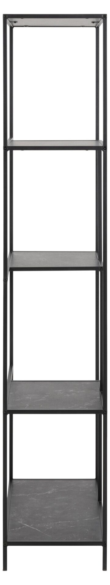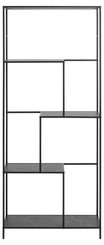 Knjižna polica Infinity prinaša minimalističen dizajn z industrijskim pridihom in asimetrično razporeditvijo polic, kar bo vašemu prostoru dodalo osebnost in slog. Z robustnim okvirjem iz mat črnega praškasto premazanega jekla ter štirimi policami v videzu črnega marmorja je ta polica idealna za organizacijo in dekoracijo. Nastavljive nogice omogočajo prilagoditev višine, kar zagotavlja stabilnost tudi na neravnih tleh.