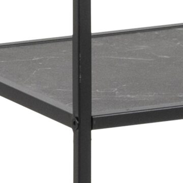 - Materiali: Mat črno praškasto premazano jeklo za okvir in police iz grobega melamina v videzu črnega marmorja (Izmir).