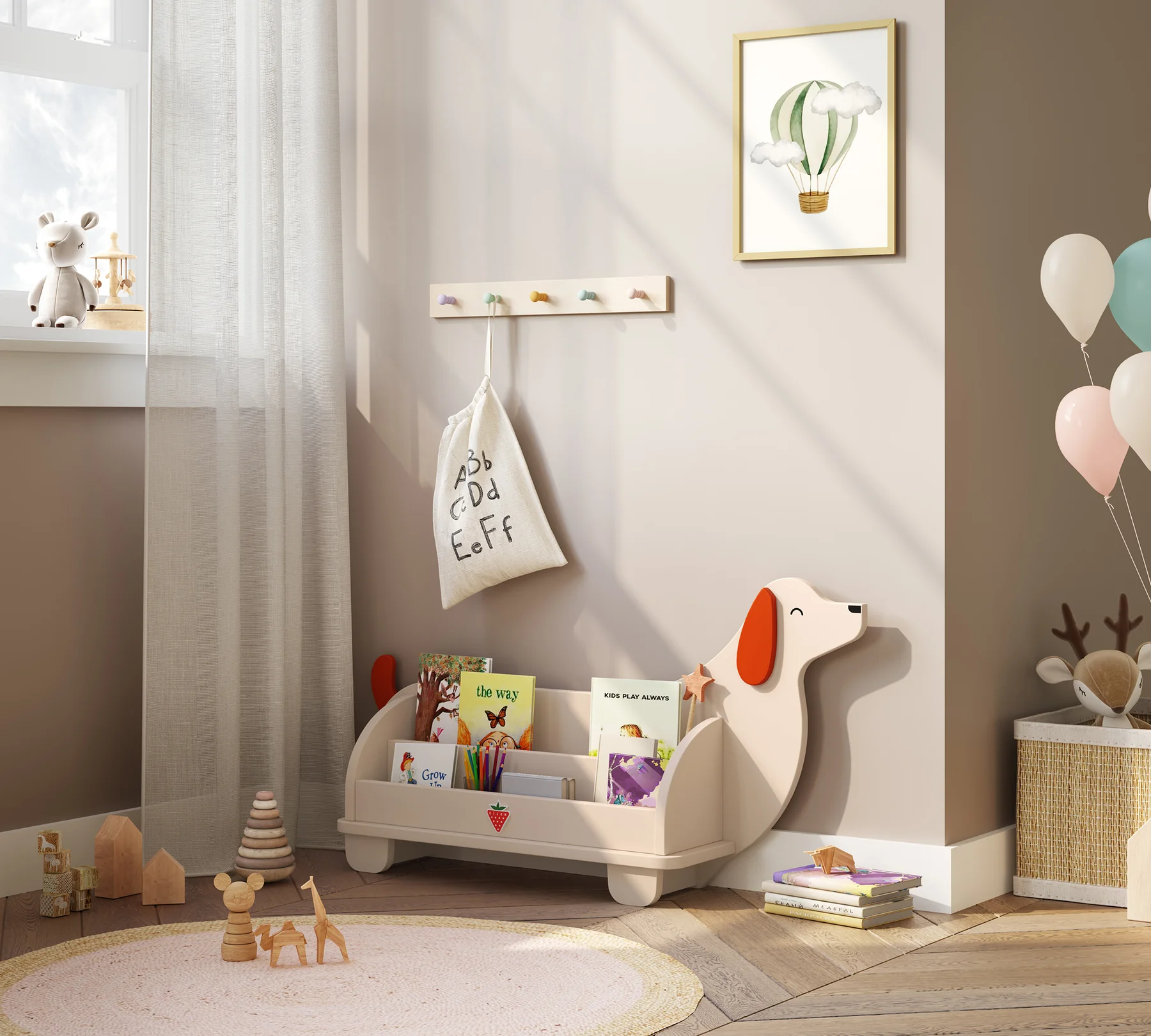 Knjižni poličnik v obliki Kužka omogoča urejeno shranjevanje knjig in hkrati ustvarja umirjen, prijeten kotiček za branje in igro. Njegova mehka, naravna oblika spodbuja otroka k raziskovanju in razvijanju lastne domišljije.