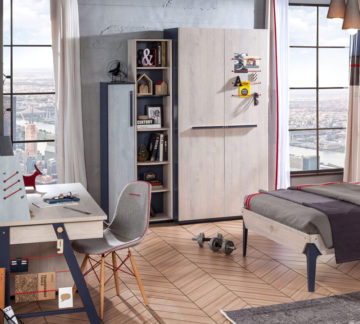 Knjižni poličnik Trio je sestavljen iz dveh manjših omar, ki se držita skupaj. Leva ima vrata, ki se mehko zapirajo, desna pa je odprta. Imata veliko polic za shranjevanje knjig, dekorja in ostalih stvari. Zaščiten je z melaminom, ki je odporen proti praskam in prahu.