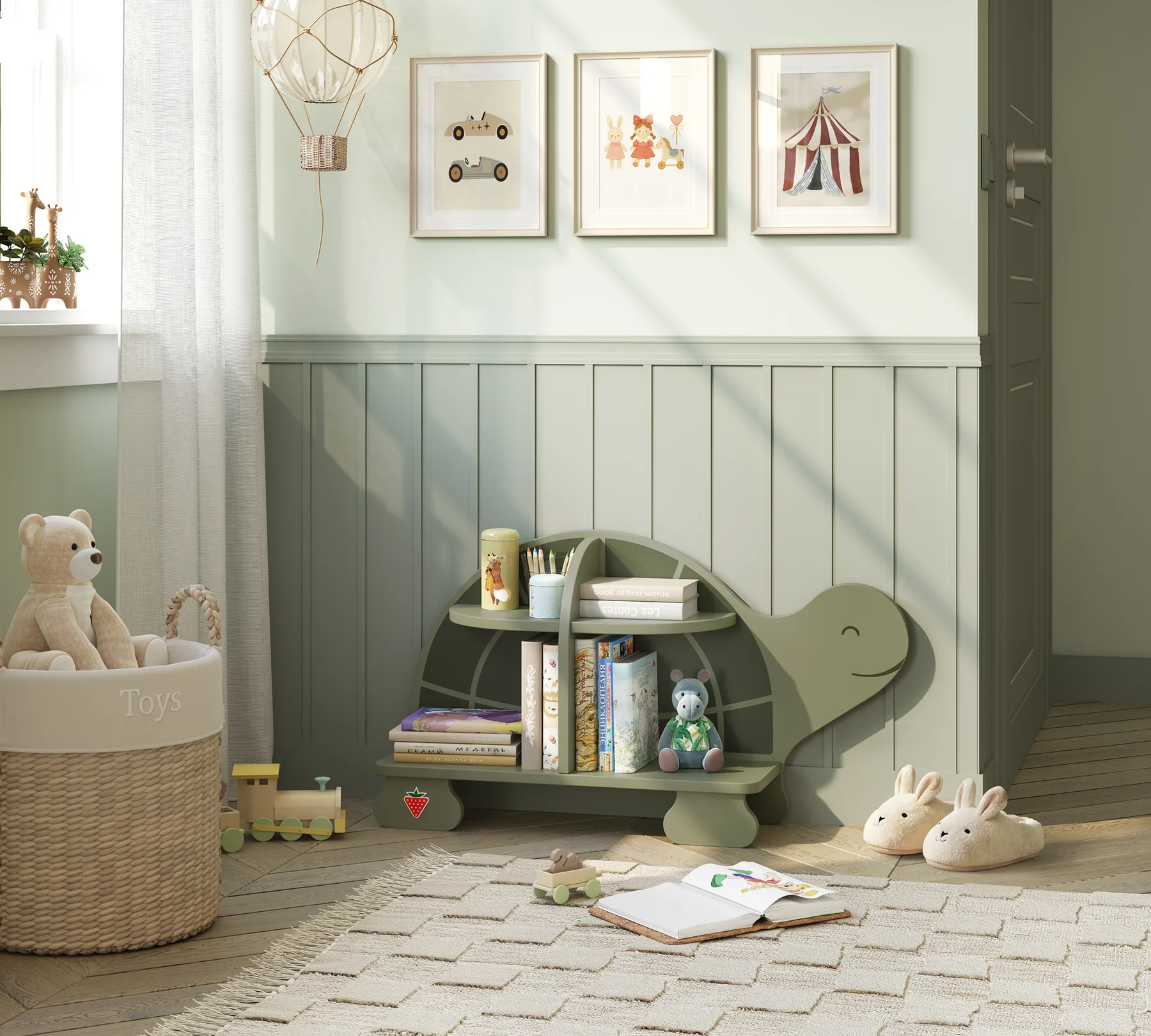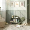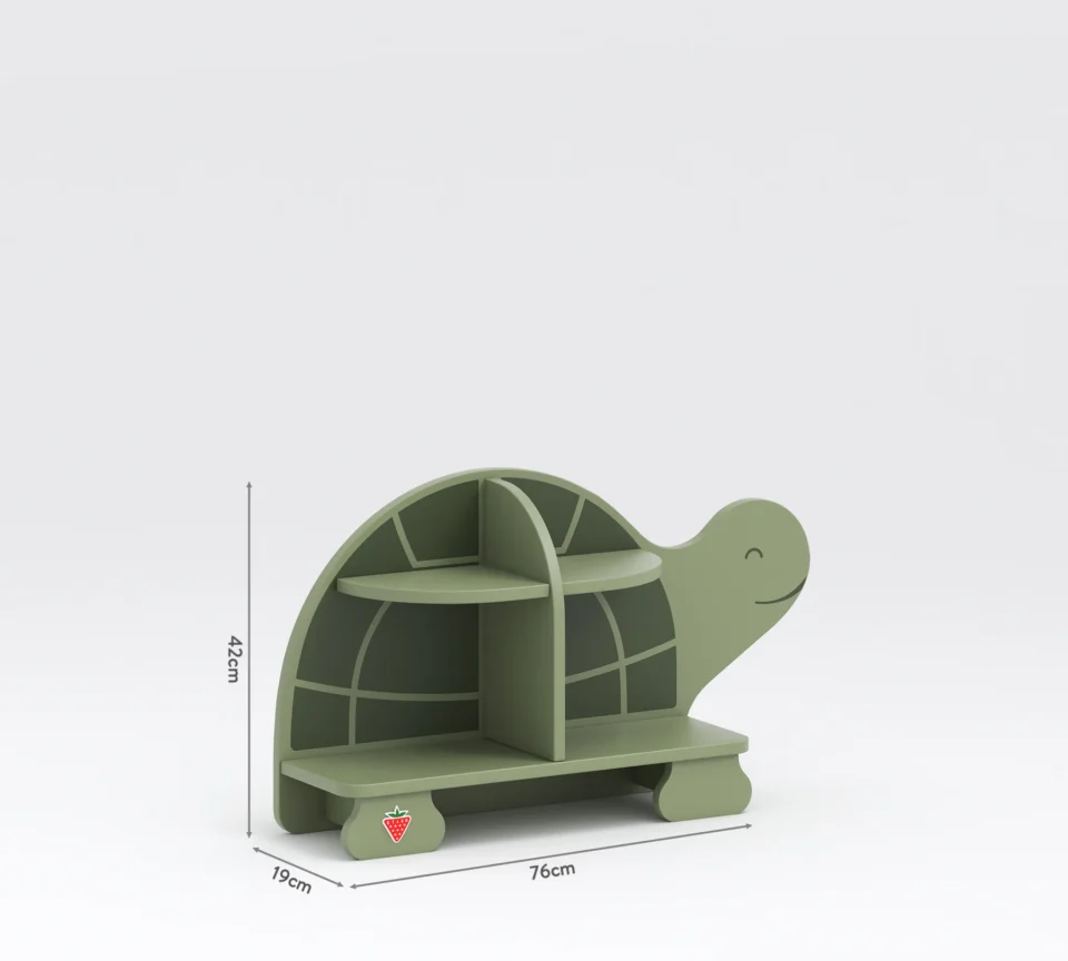 Knjižni poličnik v obliki želve omogoča urejeno shranjevanje knjig in hkrati ustvarja umirjen, prijeten kotiček za branje in igro. Njegova mehka, naravna oblika spodbuja otroka k raziskovanju in razvijanju lastne domišljije.