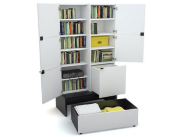 Knjižni poličnik Young users ima v notranjosti veliko polic ter eden manjši predal na podnožju pa še en večji predal za shranjevanje knjig in drugih predmetov. Knjižni poličnik z vrati je v beli barvi, podnožje-bazo pa lahko izbirate v dveh barvah. Njegov videz dopolnjuje rahlo izobčena desna polovica, ki samo še prispeva k dominantnem kubičnem videzu.