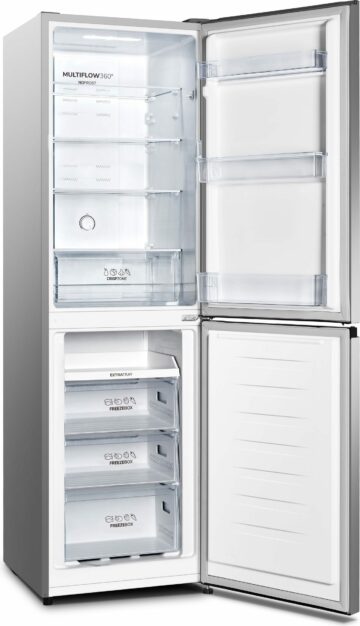 Opremljen je z elektronskim upravljanjem in NoFrost Plus tehnologijo, ki preprečuje nastajanje ledu v hladilniku in zamrzovalniku. LED osvetlitev na stropu poskrbi za dobro vidljivost v hladilnem prostoru, ki se ponaša s 3 steklenimi policami, posodo za zelenjavo in posodico za jajca. V vratih hladilnika boste našli posodo za steklenice in 2 navadni posodi za dodatno shranjevanje.