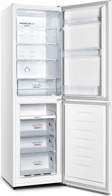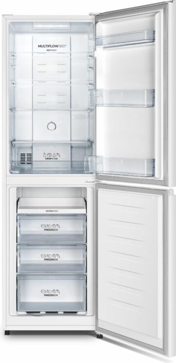 Opremljen je z elektronskim upravljanjem in NoFrost Plus tehnologijo, ki preprečuje nastajanje ledu v hladilniku in zamrzovalniku. LED osvetlitev na stropu poskrbi za dobro vidljivost v hladilnem prostoru, ki se ponaša s 3 steklenimi policami, posodo za zelenjavo in posodico za jajca. V vratih hladilnika boste našli posodo za steklenice in 2 navadni posodi za dodatno shranjevanje.
