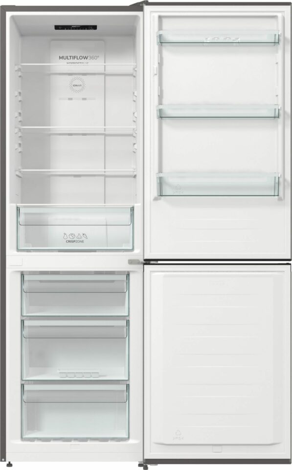 Hladilnik z energijskim razredom F ima ocenjeno letno porabo energije 301,99 kWh in nivo hrupa 38 dB, kar omogoča tiho delovanje in prijetno bivalno okolje. Material vrat je iz kolaminirane pločevine, barva izdelka pa je metalizirano siva z vrati v temno sivo česanem nerjavnem jeklu, kar daje hladilniku eleganten in sodoben videz.