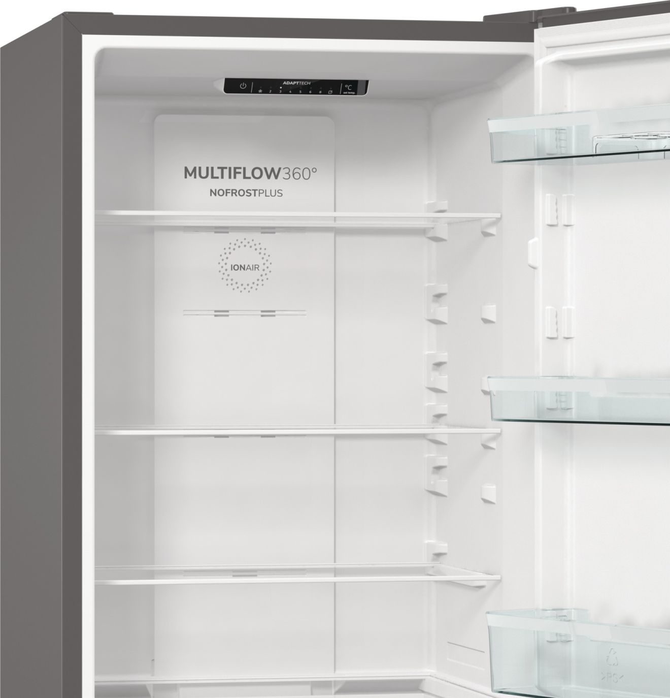 Napredna tehnologija AdaptTech hlajenja z inteligentnim sistemom pomnjenja ter IonAir s funkcijo MultiFlow 360° skrbita za enakomerno porazdelitev temperature in svež zrak v hladilnem prostoru. NoFrost Plus preprečuje nastanek ledu in zmanjšuje potrebo po rednem odtaljevanju.