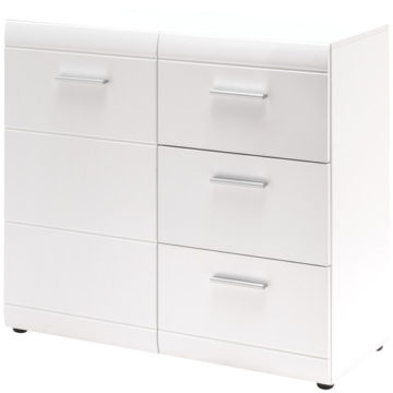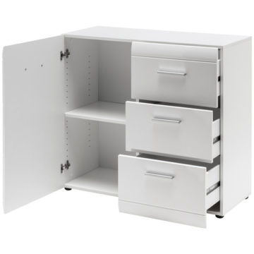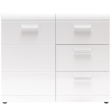 Pravi prostorski čudež je ta komoda Adana. Vse pomembne stvari so lahko vedno pri roki. S svojimi belimi visoko sijajnimi frontami iz MDF-a se komodo prilega tako modernim kot tradicionalno zasnovanim bivalnim prostorom. Komoda je sestavljena iz enih vrat in treh predalov.