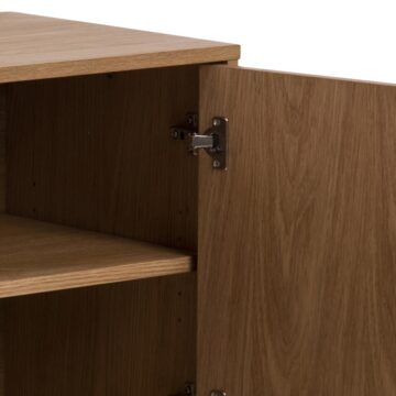 Komoda Brighton prinaša prefinjenost v vašo dnevno sobo s svojim elegantnim videzom ribje kosti. Površina iz oljenega hrastovega furnirja v kombinaciji s črnimi, lakiranimi nogami poudarja naravno lepoto hrasta in dodaja eleganten pridih. Poleg privlačnega videza ta komoda ponuja veliko prostora za shranjevanje za vrati in na nastavljivih policah ter dovolj površine za razstavljanje vaših najljubših dekorativnih predmetov.