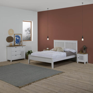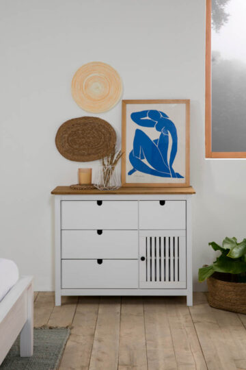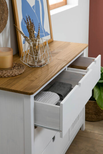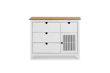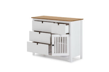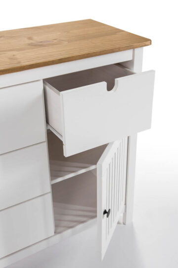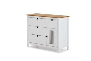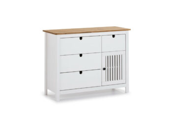 Komoda Bruna je razgibanega videza, nevtraliziranega z enostavno in elegantno kombinacija belega okvirja in lesene plošče. Ima vrata, izdelana iz deščic, in za njimi polico, ter štiri brezročajne predale. V celoti je izdelana iz borovega lesa.