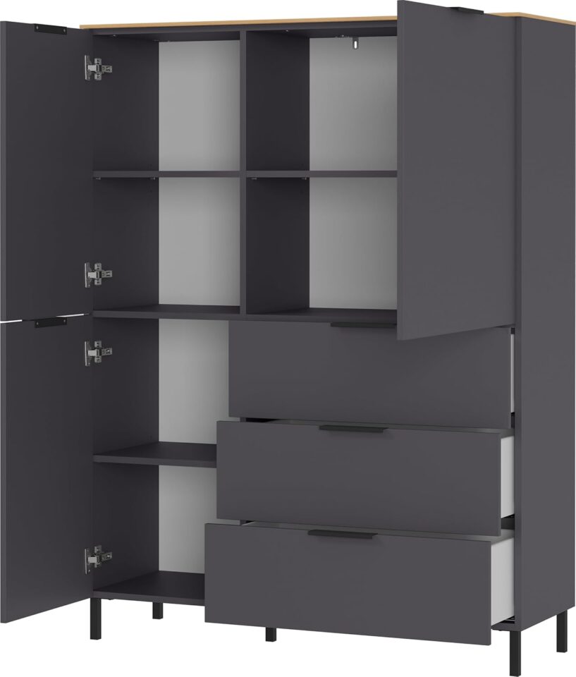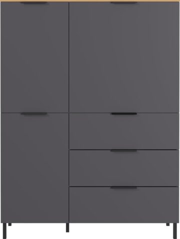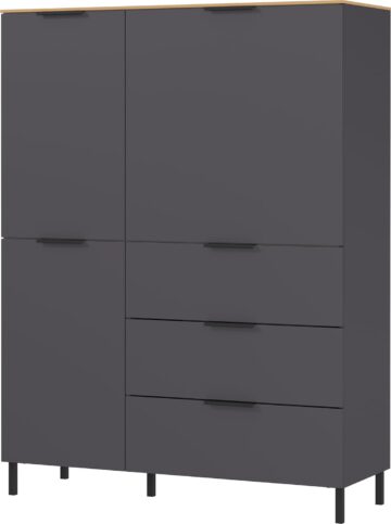 Komoda California s frontami v grafit barvi in dekorjem hrasta Navarra je sodobna rešitev za dnevne prostore, kjer sta pomembna tako videz kot funkcionalnost. Brez nepotrebnih dodatkov, a z obilico prostora za shranjevanje, navdušuje s čisto estetiko in kakovostno izdelavo.