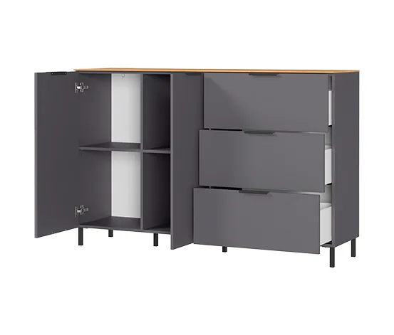 Barva komode je grafit, ki se odlično ujema z repliko pokrivne plošče iz navarskega hrasta, črni ročaji in noge pa dodajajo piko na i celotnemu izgledu.