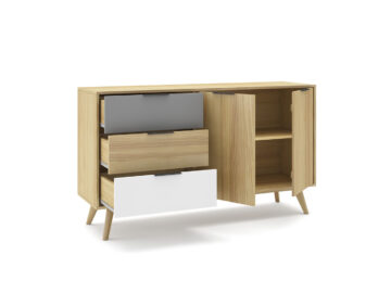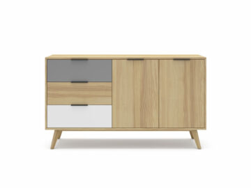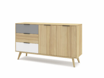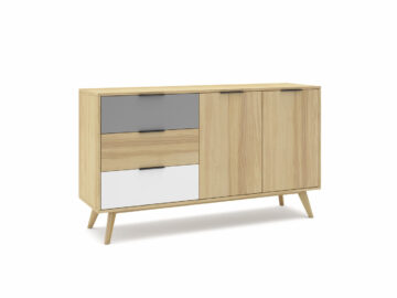 Kombinacija hrastovega, sivega in belega odtenka daje komodi Elfa sodoben in eleganten videz, ki se lepo poda v različne notranje sloge. Ta paleta barv je idealna za tiste, ki cenijo nevtralne, a izrazite odtenke in iščejo pohištvo, ki združuje lepoto naravnega lesa s sodobnim dizajnom.