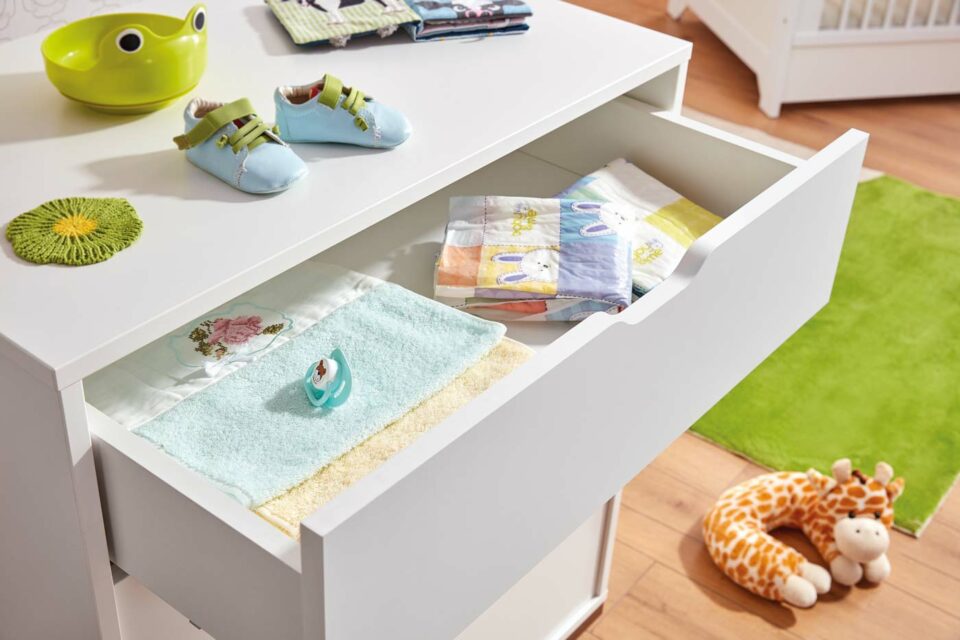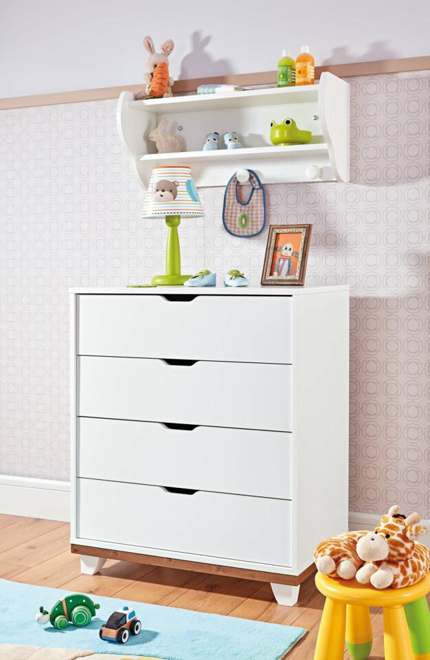 Komoda Kuku je izdelana v sodobnem in minimalističnem slogu. Za shranjevanje ima štiri predale, delujoče na sistem tihega zapiranja. Izdelana je iz oplemenitene iverne plošče, zaščitene z ABS robnim trakom.