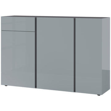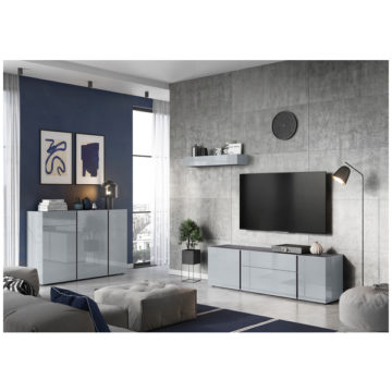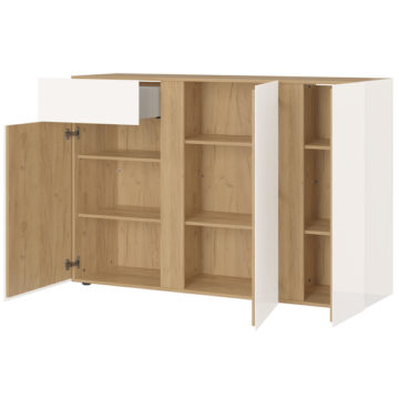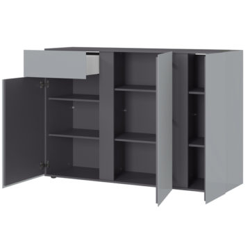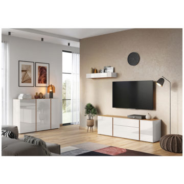 Komoda Mesa s svojimi nastavljivimi policami in predalom zagotavlja obilico prostora za shranjevanje stvari. Vsa vrata in predal se mehko zapirajo. Na voljo je v dveh barvnih kombinacijah, za dodaten lesk pa poskrbijo ojačane steklene fronte. Zaščitena je z melaminom, ki je odporen na prah in praske, ima pa tudi zarobljene ABS robove.