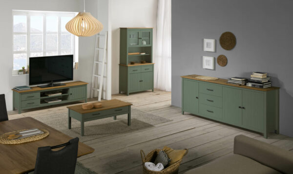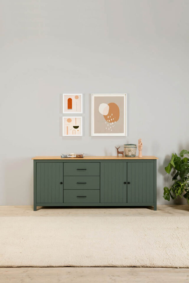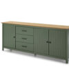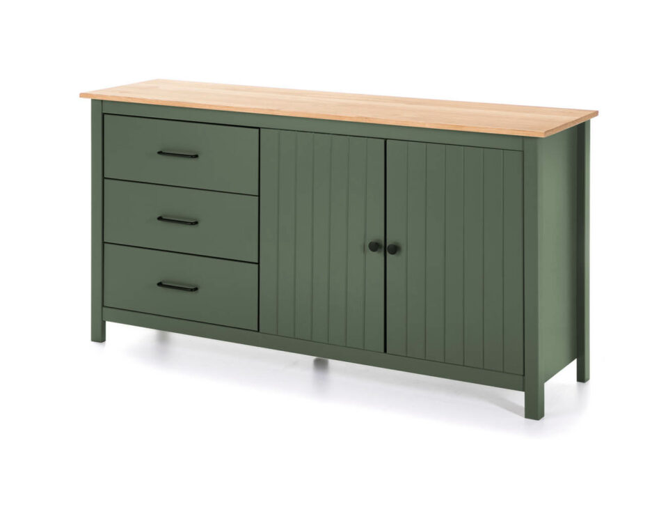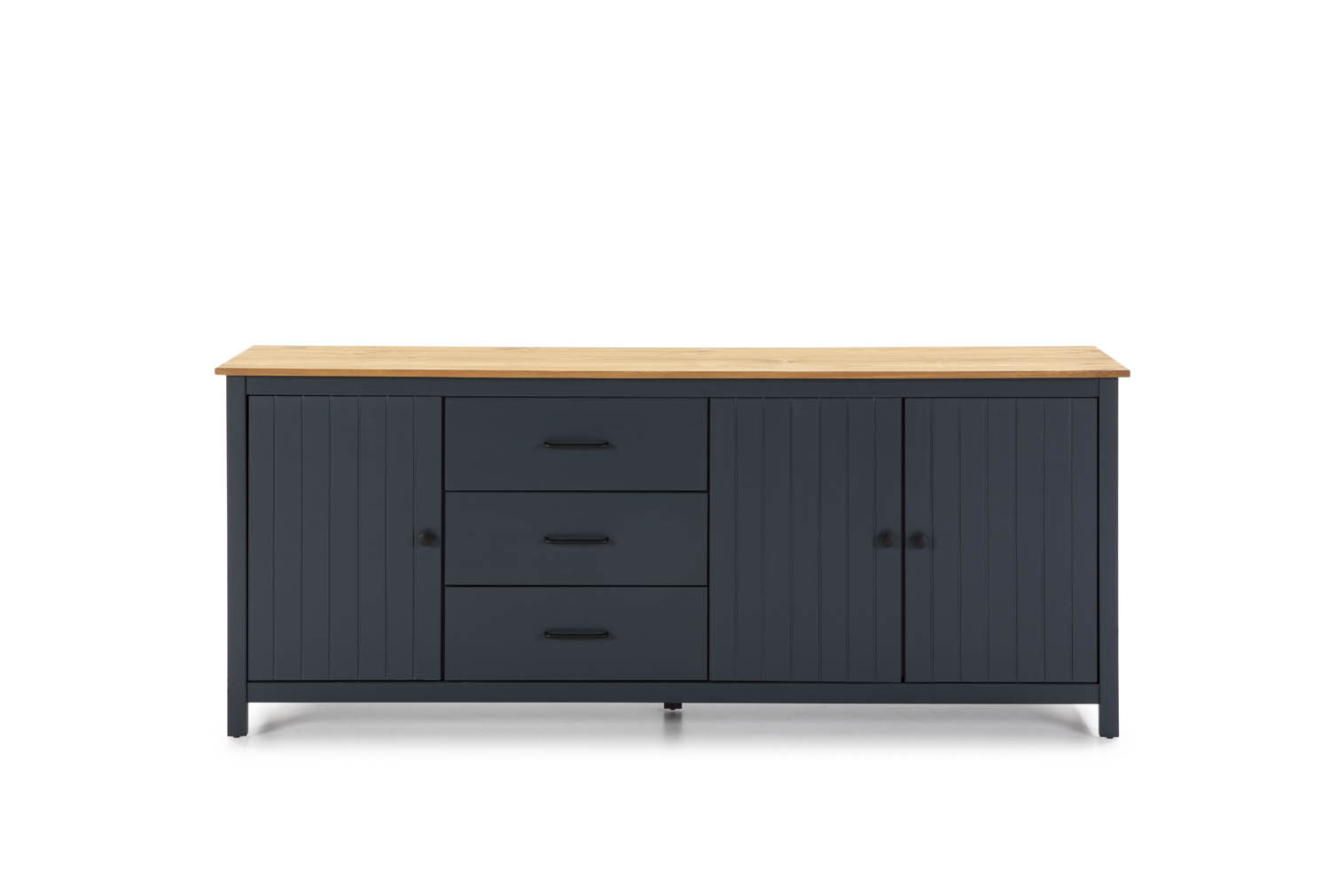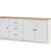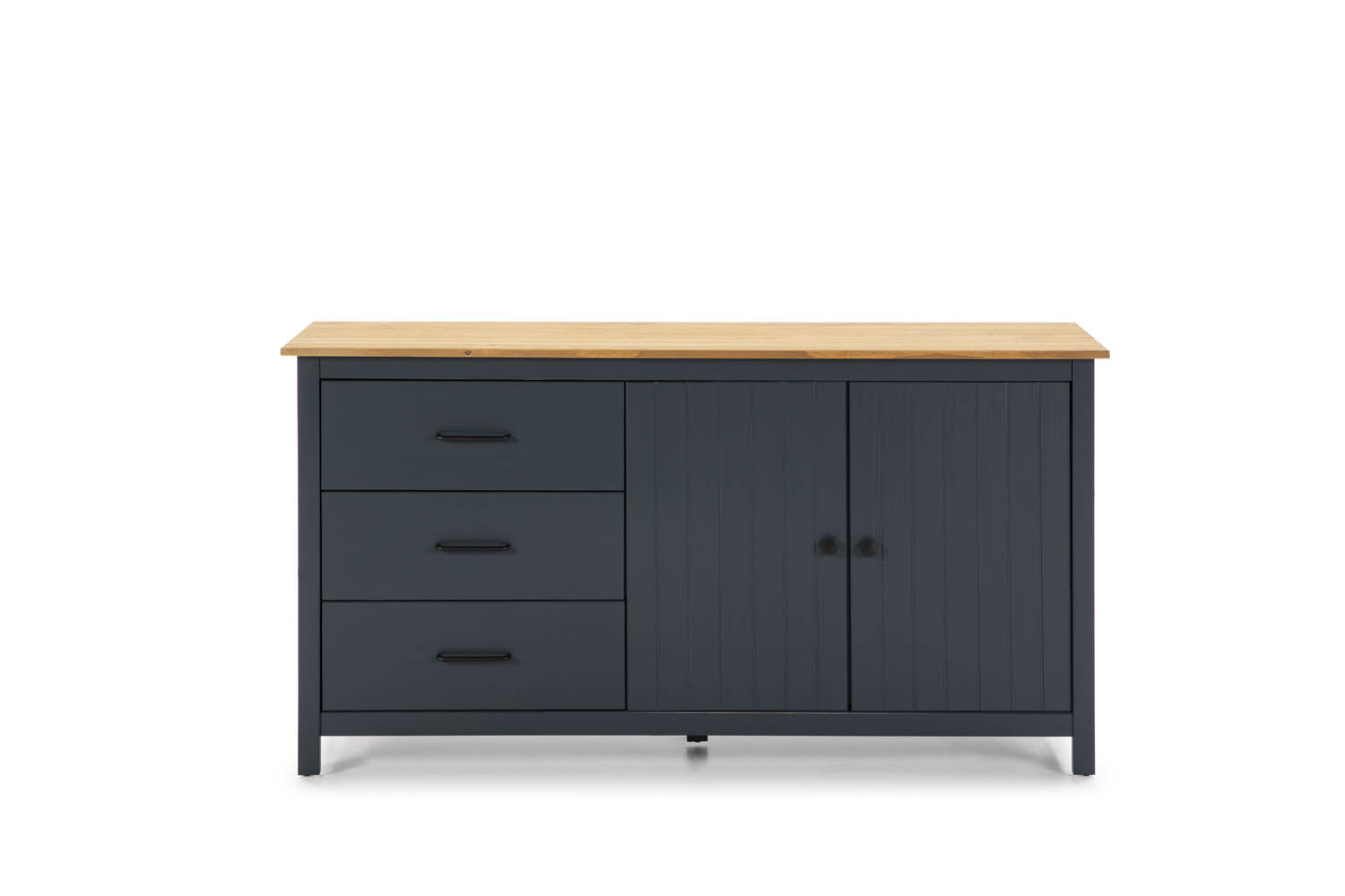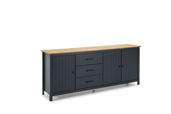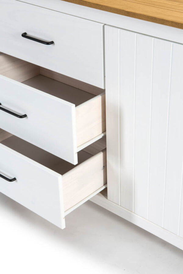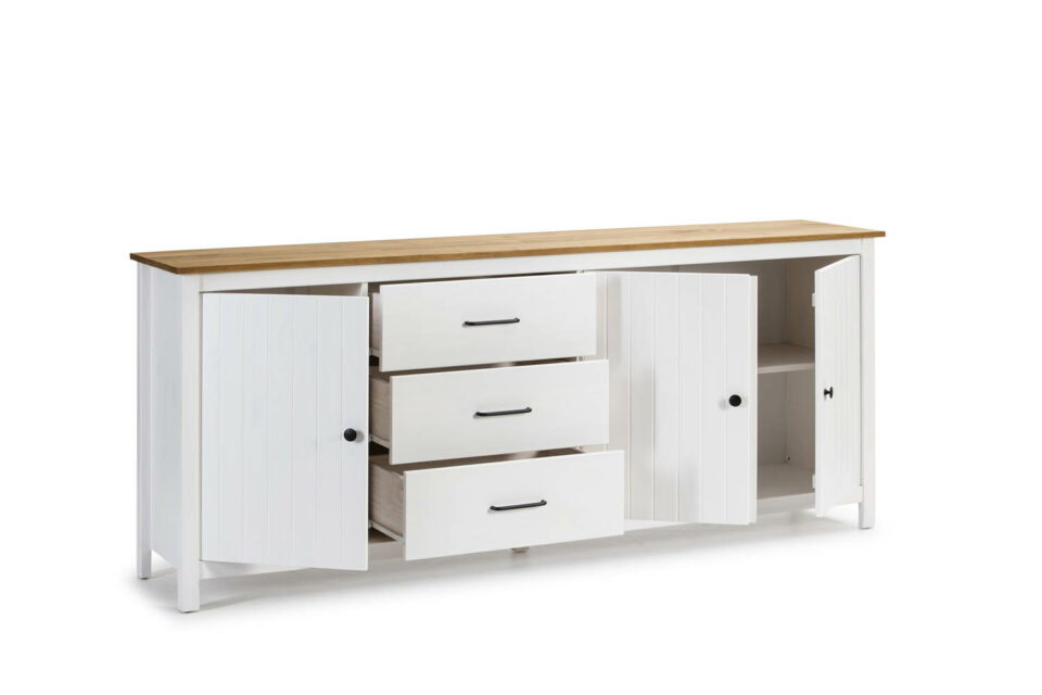 Komoda Miranda je klasične oblike, ki jo poživlja kontrastna plošča v naravnem finišu. Z izjemo kovinskih ročk je v celoti izdelana iz kakovostnega borovega lesa. Dobavljiva je v šestih različicah. Daljša različica ima vrata več.