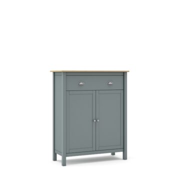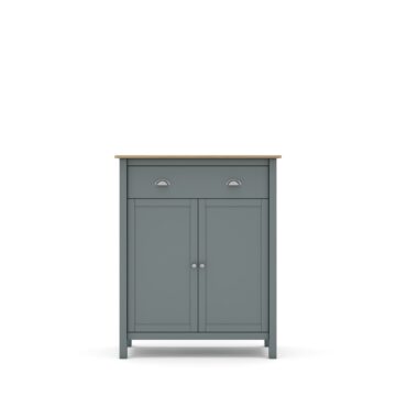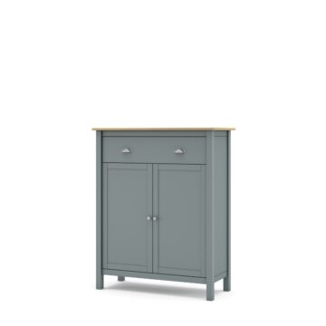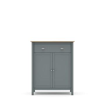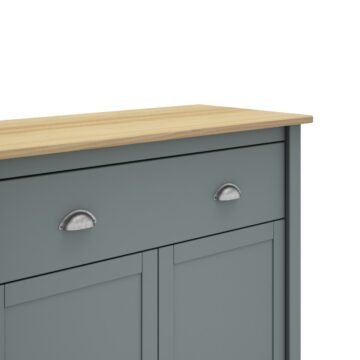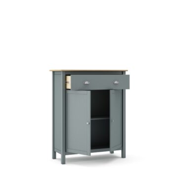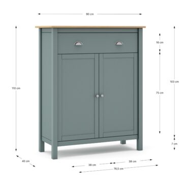 Komoda MISTI je izdelana iz masivnega borovega lesa v zeleni/sivi barvi in ponuja shranjevalni prostor s predali in vrati, ki skrivajo police. Zgornja plošča komode je v naravnem borovem odtenku, kar ustvarja zanimiv kontrast. Komoda je primerna za različne prostore, kot so dnevna soba, spalnica ali hodnik, zaradi preprostega, a elegantnega dizajna se zlahka vključi v različne sloge opremljanja. Kombinacija zaprtega in odprtega shranjevalnega prostora omogoča organizirano shranjevanje različnih predmetov.