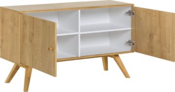 Preprosta in minimalistična komoda ima za parom vrat dve polici in skupno štiri predele za shranjevanje. Podnožje je v barvi hrasta, notranjost pa bela. Lepa in ujemajoča kombinacija barv bo olajšala kombiniranje. Izdelana je iz melaminsko zaščitene iverne plošče