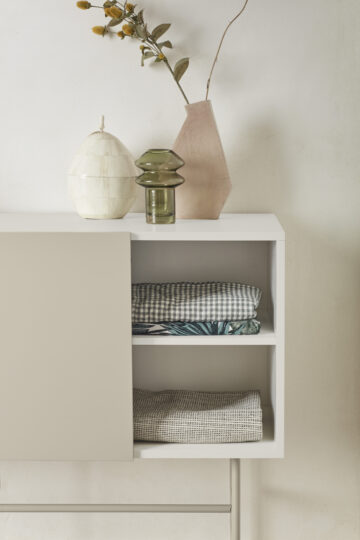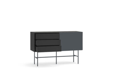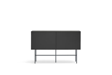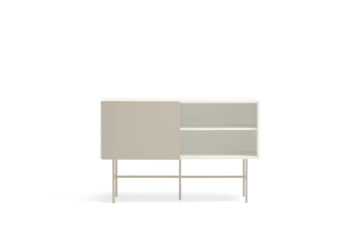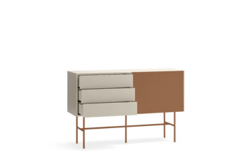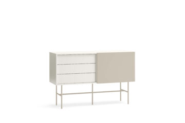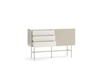 Brezčasna komoda Nube vas bo očarala s svojim minimalističnim dizajnom in okusnimi kombinacijami barv. Izdelana je iz lakiranega MDF-a in elegantnega kovinskega podnožja. Praktični prostor za shranjevanje obsega 2 predala in 2 polici, ki jih lahko prekrijete s premičnimi vrati. Preproste in čiste linije komode poudarja dizajn brez ročajev. Lahko se zanesete na praktični sistem Push to open, ki omogoča, da predale enostavno odprete brez ročajev. Komoda je na voljo v treh barvnih izvedbah.