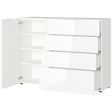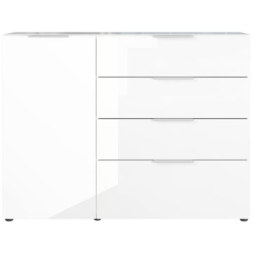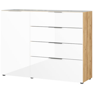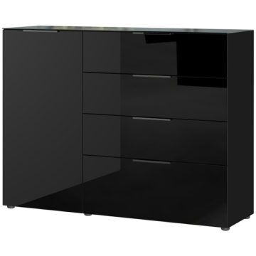 Komoda je sestavljena enih vrat in štirih predalov z mehkim zapiranjem. Na voljo so tri barvne kombinacije z elegantnimi steklenimi sprednjimi ploščami in zgornjimi ploščami. Dodaten lesk zagotovijo kovinski ročaji. Zaščitena je z melaminom, ki je odporen na prah in praske, ima pa tudi zarobljene ABS robove.
