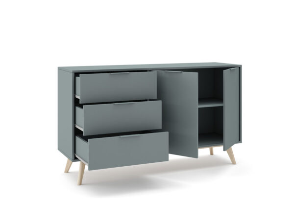 Komoda Pisco v tem večjem modelu nudi še več prostora za shranjevanje z dvojimi vrati in tremi predali. Dvoja vrata skrivajo prostorno notranjost, ki je idealna za shranjevanje večjih predmetov, kot so posteljnina, brisače ali igrače. Trije predali so primerni za urejeno shranjevanje manjših predmetov, kot so obleke, dodatki ali pisarniški pripomočki.
