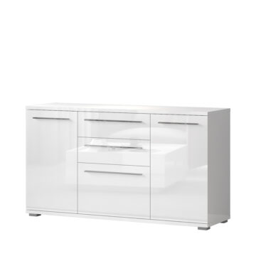 Komoda Radda PIANO je UV lakirana na visoki sijaj v bež ali beli barvi. Vsebuje tri vrata širine 50cm ter dva predala. Spodnja in zgornja plošča sta 25mm in s tem še močnejši oz. z večjo nosilnostjo. Ročaji in noge so kromirani. Vse fronte se tiho zapirajo. Omarica je iz zelo obsežnega sestavljivega programa, ki ima na razpolago ogromno elementov.