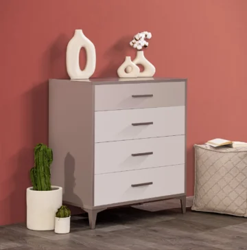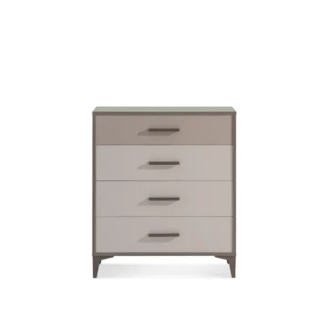 Komoda Ria ponuja praktično shranjevalno rešitev s pridihom osebnega sloga. Zgornja površina komode je idealna za dekorativne namene, kjer lahko najstniki razstavijo svoje najljubše fotografije, majhne rastline ali druge okrasne predmete, s čimer dodajo osebno noto svoji sobi. Ta dodatna funkcionalnost prispeva k celostni estetiki prostora.