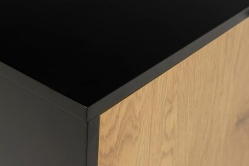 - Materiali: Črno PU lakiran MDF in melamin v videzu divjega hrasta, podnožje iz mat črno prašno lakiranega jekla