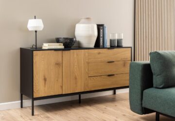 Komoda Seaford je vsestranski kos pohištva, idealen za kuhinje, dnevne sobe ali jedilnice. Ponuja dovolj prostora za shranjevanje, kjer lahko za vrati in v predalih shranjujete kuhinjske pripomočke, oblačila ali druge potrebščine, medtem ko vrhnja polica nudi možnost za razstavljanje dekorativnih predmetov. Njena kombinacija industrijskega in naravnega videza se zlahka prilega sodobnim in klasičnim interierjem.