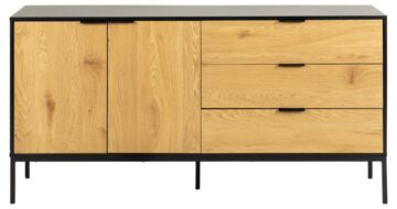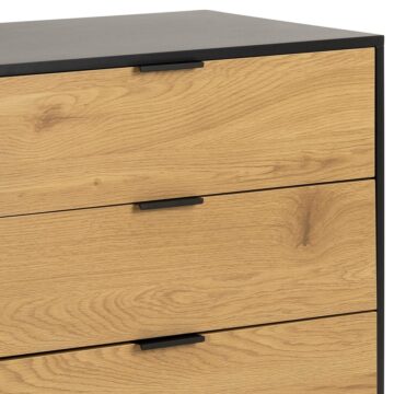 Komoda Seaford je popolna izbira za tiste, ki želijo v svoj dom vnesti pridih industrijskega sloga z dodatkom naravnih materialov. Narejena iz mat črno pobarvanega MDF-ja in furnirja v videzu divjega hrasta, ta komoda ponuja funkcionalnost z dovolj prostora za shranjevanje, ki se skriva za dvema vratoma, tremi predali in na polici. S svojo kombinacijo črnega jekla in hrastovega videza se komoda brez težav zlije z različnimi stili notranje opreme.