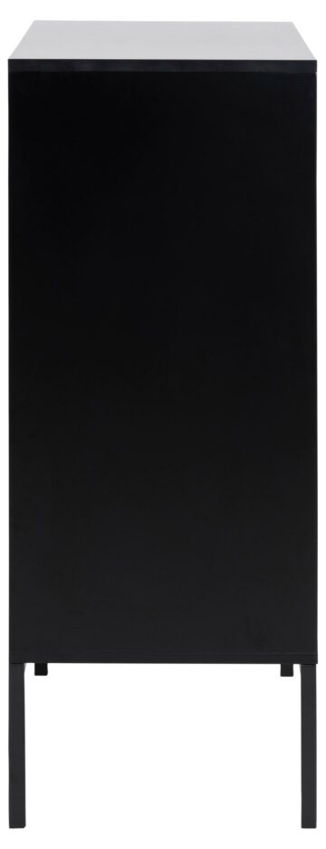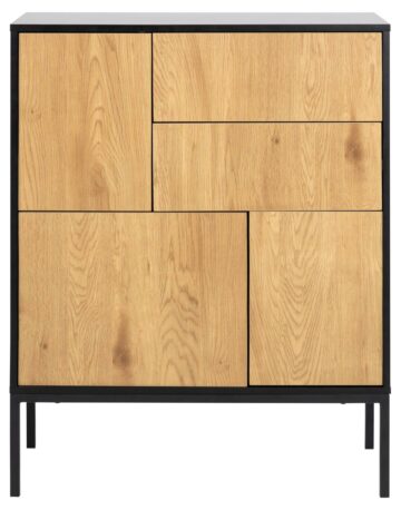 Komoda Seaford je izdelana iz MDF-mediapana, kjer je okvir komode lakiran v matirano črno barvo. Komoda vsebuje 3 vrata in 2 predala izdelana v odtenku divjega hrasta. Zaradi svoje prostornosti in uporabnosti, je takšna komoda več kot zaželena v spalnicah, dnevnih sobah ali poslovnih prostorih. Pod komodo lahko najdemo podnožje, ki je kovinsko in prašno barvano v črno barvo.