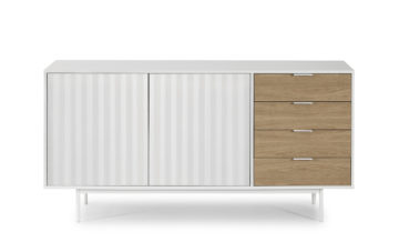 Komoda Sierra je izdelana iz lakirane MDF plošče. Sprednji predali so krašeni z furnirjem naravnega hrasta. Noge komode so izdelane iz kovine in merijo 18 cm v višino. Maksimalna nosilnost znaša 40 kg.