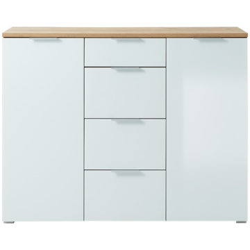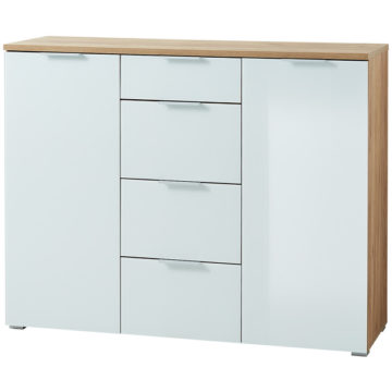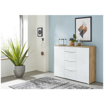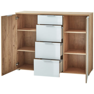 Komoda Telde je idealna za predsobni prostor, kot za ostale prostore. Fronte so nadgrajene s kaljenim steklom, kar omogoča lažje čiščenje, medtem ko za trden prijem skrbijo kovinski ročaji. Komoda je sestavljena iz štirih priročnih predalov in dveh vrat za katerimi se skrivata po dve polički.  S svojo barvno kombinacijo bele in hrasta navarra se prilega tako tradicionalno kot moderno opremljenim bivalnim prostorom. Vsi robovi so zaščiteni s trpežnim ABS robom. Vse ostale površine, ki so dodatno zaščitene z melaminskim premazom, ki še dodatno ščiti pred umazanijo.