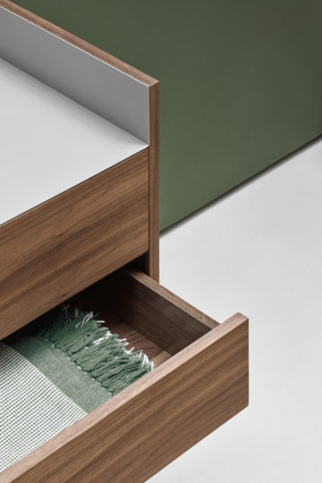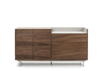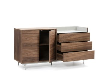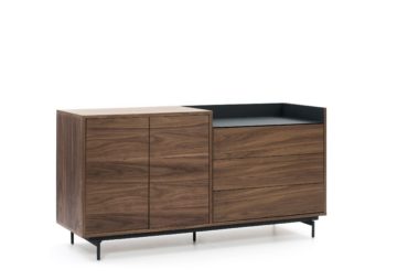 Kolekcija Valley temelji na univerzalnosti, tesno povezani z elegantnostjo. Ostre in jasne linije, novodoben sistem odpiranja na dotik in jesenov furnir so samo nekatere od zamisli kreativnega Cambre Designa. Vsak Valley kos je harmoničen spoj lesa in kovine. Komoda je izdelana iz MDF plošče, obogatene s furnirjem jesena, pločevine in kovine. Za parom vrat je polica. Na desni strani omarice je zgoraj odprt predel, krašen s kontrastično pločevino, pod njim pa tri predali. Izberete lahko barvo pločevine, ki se nahaja desno zgoraj: 1. Svetlo siva 2. Temno modra Dimenzija (dolžina x širina x višina): 150x45x78 cm Kljub svoji fleksibilnosti, stoji najbolje v zasedbi sorodnih izdelkov.