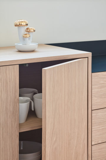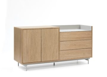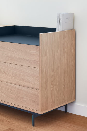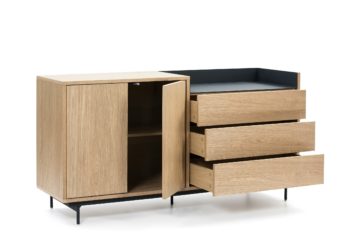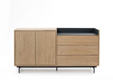 Kolekcija Valley temelji na univerzalnosti, tesno povezani z elegantnostjo. Ostre in jasne linije, novodoben sistem odpiranja na dotik in furnir od hrasta so samo nekatere od zamisli kreativnega Cambre Designa. Vsak Valley kos je harmoničen spoj lesa in kovine. Komoda je izdelana iz MDF plošče, obogatene s furnirjem hrasta v svetlejšem odtenku, pločevine in kovine. Za parom vrat je polica. Na desni strani omarice je zgoraj odprt predel, krašen s kontrastno pločevino, pod njim pa tri predali. Izberete lahko barvo pločevine, ki se nahaja desno zgoraj: 1. Svetlo siva 2. Temno modra Dimenzija (dolžina x širina x višina): 150x45x78 cm Kljub svoji fleksibilnosti, stoji najbolje v zasedbi sorodnih izdelkov.