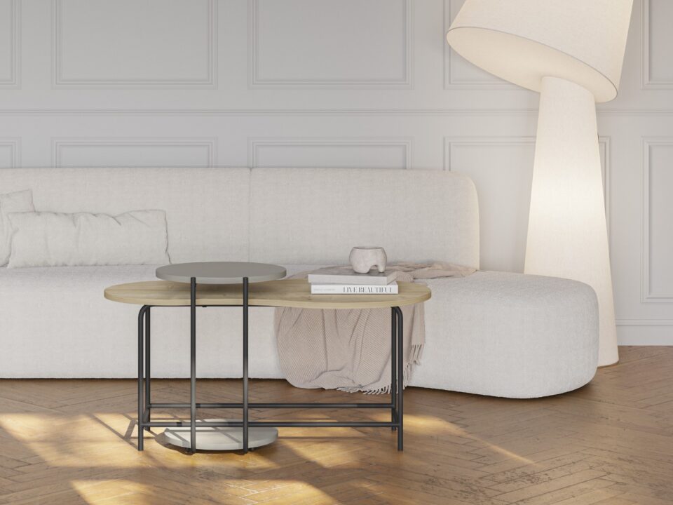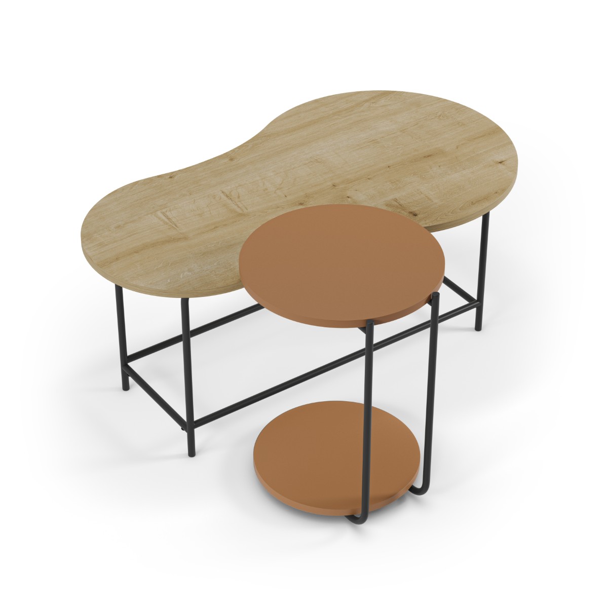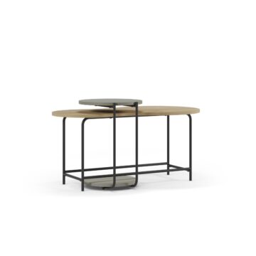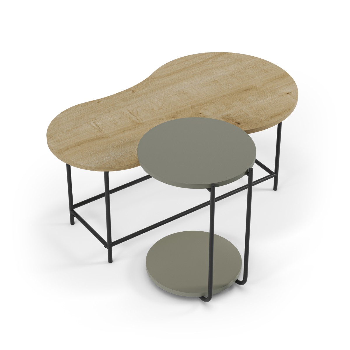 Klubski mizici Rosie izstopata z igrivo organsko obliko in dvema premičnima okroglima površinama. V kombinaciji imitacije hrasta in barvnih plošč ustvarjata dinamičen osrednji element v dnevni sobi.
