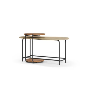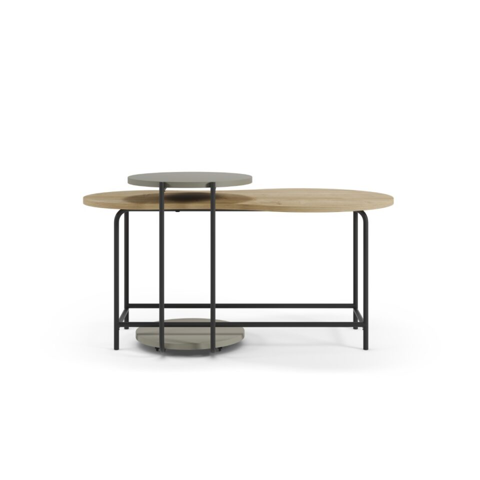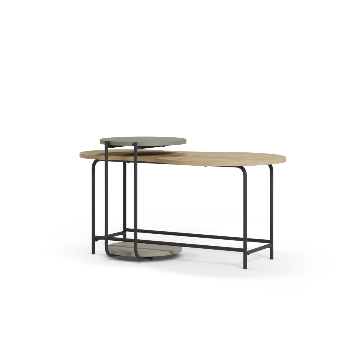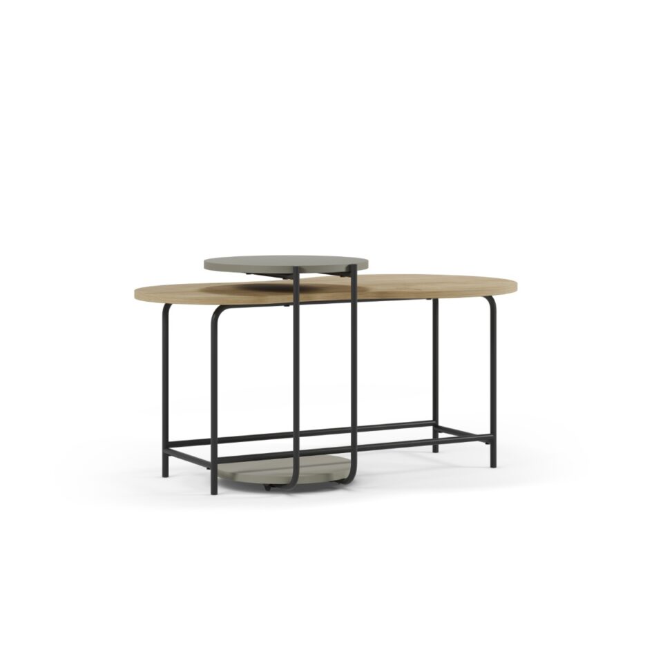 Klubski mizici Rosie izstopata z igrivo organsko obliko in dvema premičnima okroglima površinama. V kombinaciji imitacije hrasta in barvnih plošč ustvarjata dinamičen osrednji element v dnevni sobi.